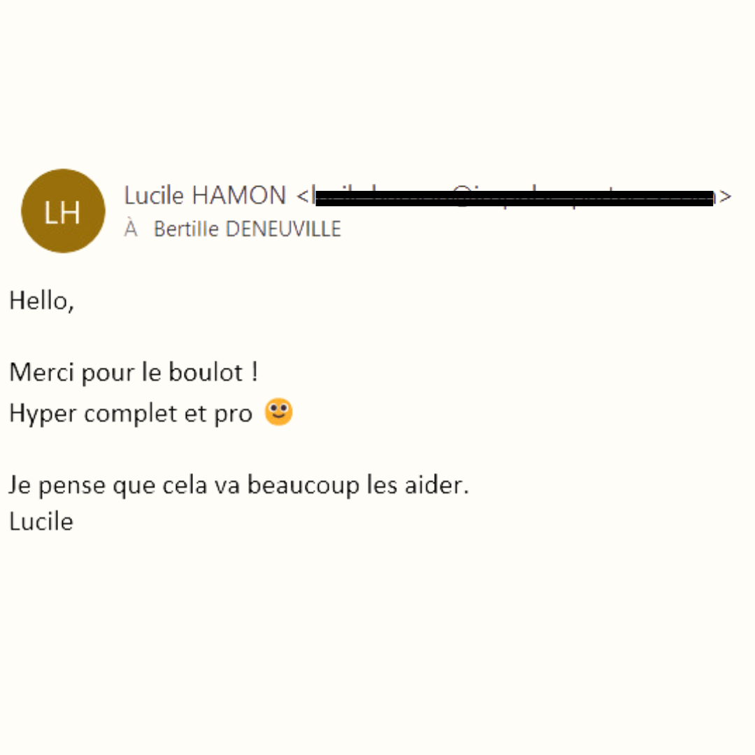 Bertille est une jeune femme très dynamique, quand elle participe à un projet c’est à fond avec abnégation et un professionnalisme irréprochable. Et toujours dans la bonne humeur.